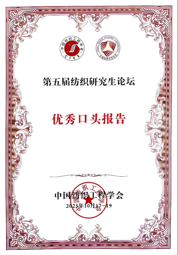 近日,从江苏南通举办的第十五届中国纺织学术年会传来喜讯,BBIN宝盈游戏官网学子在中国纺织领域两项顶级学术活动中斩获佳绩。由硕士生黄雍宝撰写、杨帆副教授指导,我校为第一完成单位的学术论文《光致变色纺织品的制备及其防伪应用》,成功入围第26届陈维稷优秀论文卓越行动计划,并被推荐至《纺织学报》快速发表。同时,黄雍宝同学在第五届纺织研究生论坛上的出色表现,荣获了大会颁发的“优秀口头汇报”奖。