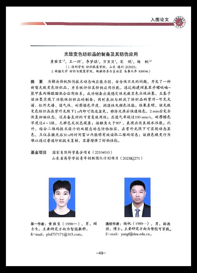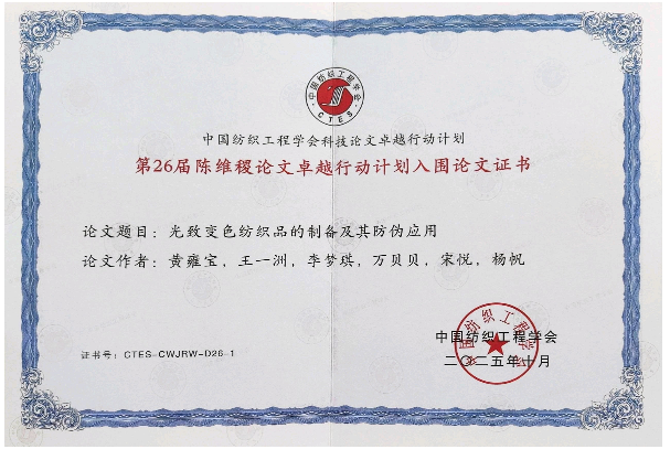 《纺织学报》是由中国科学技术协会主管、中国纺织工程学会主办的旗舰级学术期刊、中国科技期刊卓越行动计划中文梯队期刊,是国内纺织领域最具权威性和影响力的核心期刊。此入围论文致力于开发一种新型光致变色纺织品,探索其在防伪领域的创新应用,研究成果前沿,具有重要的理论价值与广阔的市场前景,得到了学会与评审专家的高度认可。