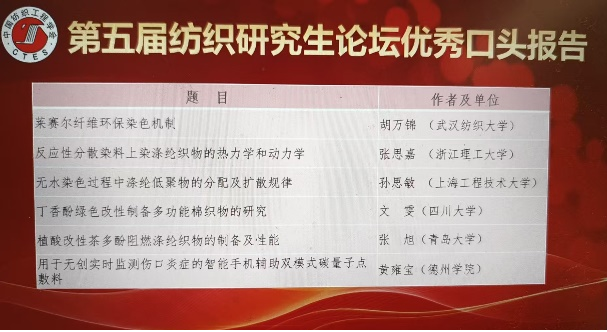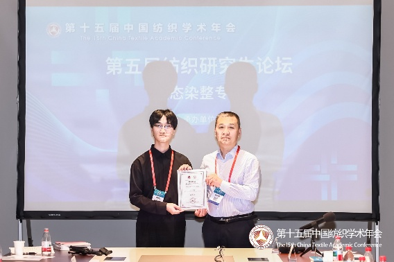 在第五届纺织研究生论坛上,黄雍宝同学就其研究成果《用于无创实时监测伤口炎症的智能手机辅助双模式碳量子点敷料》进行了精彩宣讲,以清晰的逻辑、流利的表达和扎实的专业素养,从容应对评委提问,其综合表现赢得了广泛好评,最终荣获“优秀口头汇报”奖。