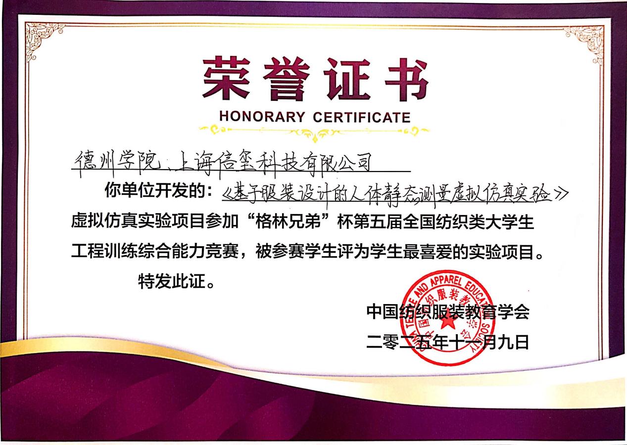 在刚刚结束的第五届全国纺织类大学生工程训练综合能力竞赛中,BBIN宝盈游戏官网开发的“基于服装设计的人体静态测量虚拟仿真实验”作为比赛项目,荣获服工组“学生最喜爱实验项目”。