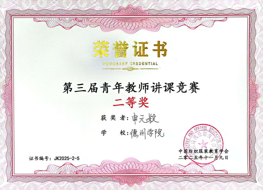 近日,由中国纺织服装教育学会主办的第三届青年教师讲课竞赛和教案竞赛在武汉圆满落幕。BBIN宝盈游戏官网青年教师申元颖凭借扎实的教学功底、创新的教学设计与精彩的现场展示,充分展现了学院青年教师过硬的教学基本功和创新育人理念,得到了评委专家的高度认可,荣获讲课竞赛二等奖。
