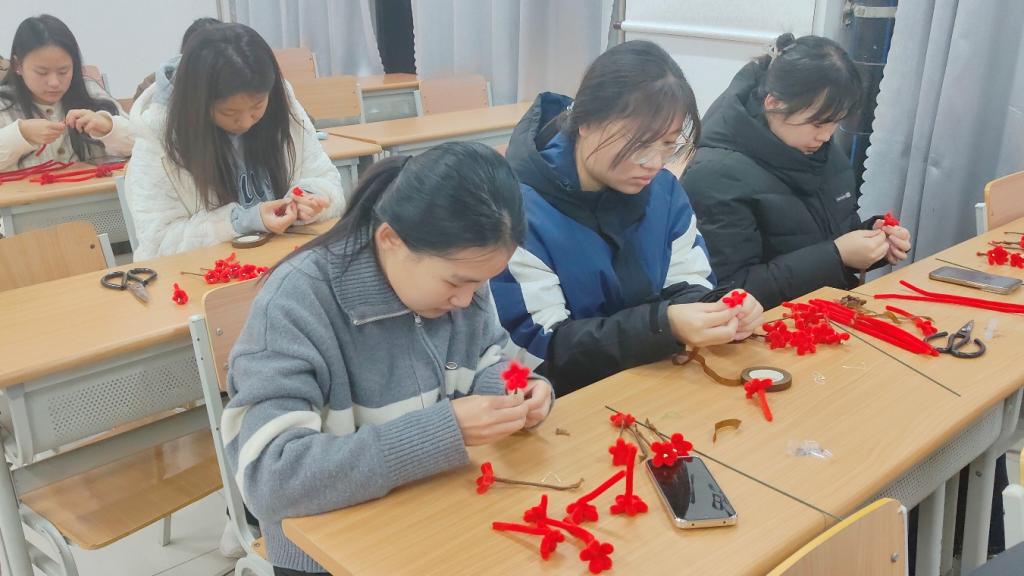 梅花贴枝上,巧手造梅景。同学们用粘贴的方式,将做好的红色梅花一朵朵固定在棕色梅枝上,并调整花朵的疏密与朝向。简单的手工技法搭配巧思,普通的扭扭棒便化作栩栩如生的梅花枝,让国风美学的韵味融入日常。活动结束后,同学们捧着各自独一无二的梅花枝作品纷纷表示,这看似简单的扭扭棒竟能还原出梅花的风骨,亲手制作的过程,比单纯欣赏成果更能体会国风美学的细节之妙。
