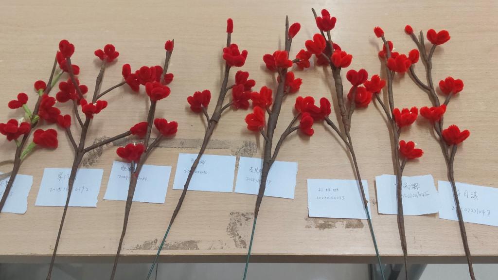 扭棒做花瓣,折枝塑梅干。同学们先选取红色与棕色扭扭棒为核心材料,在负责人的指导下用扭、折的手法将红色扭扭棒塑成层层叠叠的梅花花瓣,让每一片花瓣都呈现出自然的弧度与形态;再把棕色扭扭棒弯折出坚劲的梅枝轮廓,模拟梅花枝干的苍劲质感。